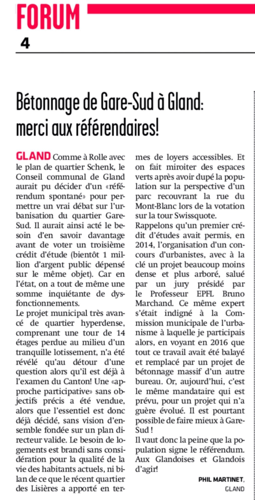 À Gland, la mobilisation citoyenne prend de l’ampleur. Un référendum a été lancé contre le préavis 82, qui prévoit une densification massive du quartier Gare-Sud. Ce projet soulève de nombreuses inquiétudes : manque de transparence, absence de vision d’ensemble et risques de bétonnage excessif dans un secteur jusqu’ici paisible.